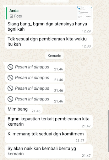 Dalam isi percakapan yang beredar, terlihat adanya pembahasan mengenai “komitmen” tertentu yang diduga berkaitan dengan pemberitaan. Bahkan, terdapat indikasi bahwa sebuah berita dapat kembali dipublikasikan apabila kesepakatan yang dimaksud tidak berjalan sesuai rencana.